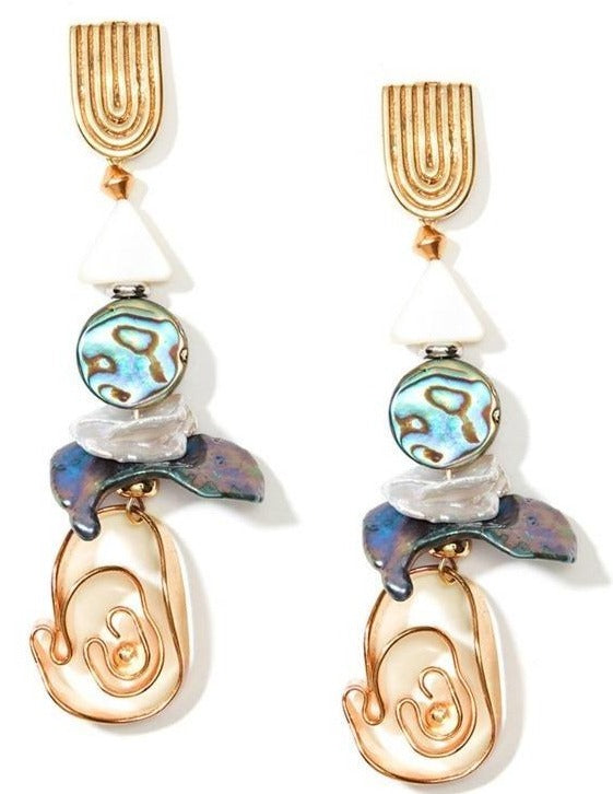 These complex earrings come with a variety of intricate pieces, blended together to provide an eye-catching standalone set. Created using a Dhokra technique, these waterfalls flower into genuine Mother of Pearl arrows and abalone spheres, ending with a curving feature.