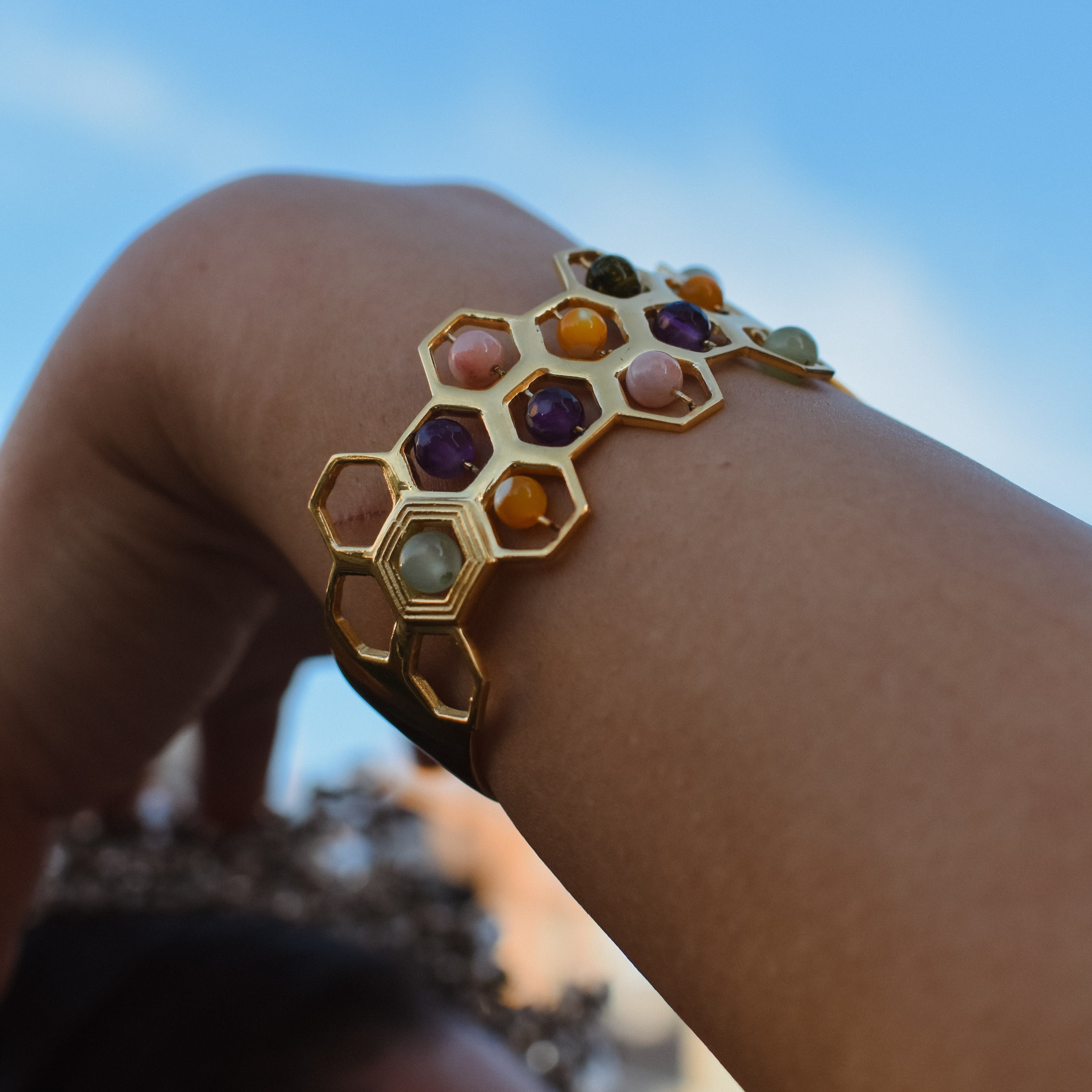 "I am Queen, I am the unseen and the seen. I am that radiant light all esteem, I am the Supreme." Holding the power of 6 magnificent gemstones. Honey Jade of prosperity; produces longevity. The all-rounded Amethyst brings out the amplification of the power of Opal. Abundant luck of Nephrite Jade, the lightness of being of fancy Jasper and prosperity of Aventurine. Our intention is for this vibrant statement piece to look as powerful as you feel.