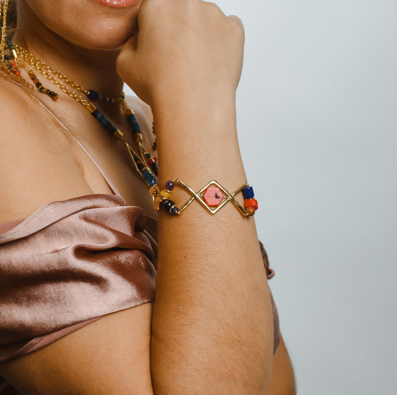 Grow sweet Lover of life with your laughter trickling into every flower that blooms. The inclusion of Black Onyx and Tiger's eyes, as an energetic shield activates the longevity of Honey Jade and Lapis Lazuli clears the throat for crystal clear communication.