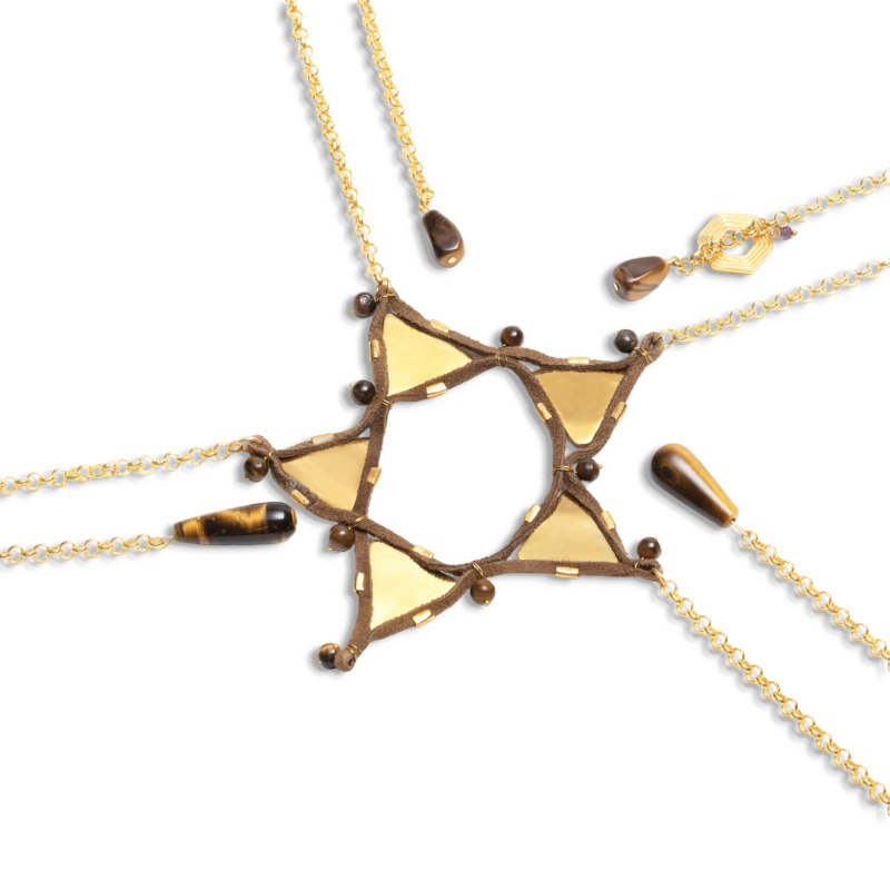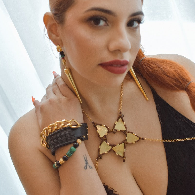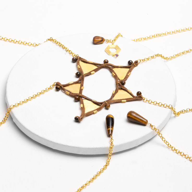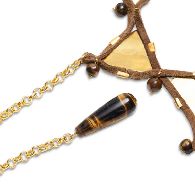 Queen is intimately seduced by the form and the formless. Handcrafted to adorn your shapes and shadows. She unearths Galaxies in the depth of her waters. This piece is hand-crafted with vegan leather and the protective courage of Tiger's Eye.