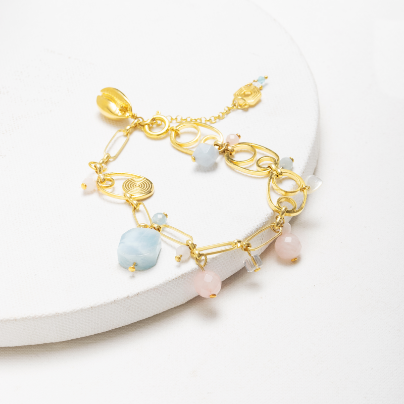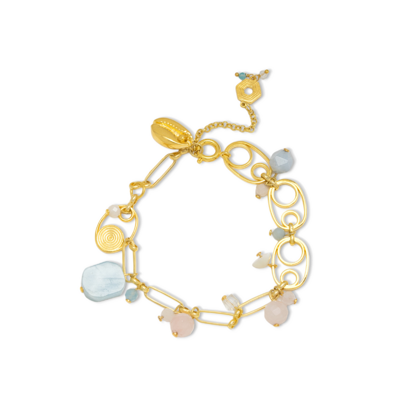 Pieced together with love and intention Agate, Rose Quartz, Aquamarine, Mother Pearl and Sea Shell create the perfect portal of rebalancing through releasing emotional blockages, stimulating your intuition and inviting positive thoughts, wealth and prosperity.