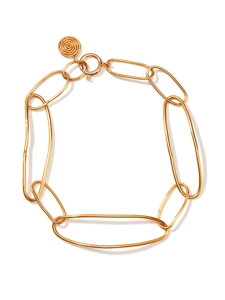 Long linked ellipses form this minimal chain necklace. This adjustable necklace can be paired with most accessories, making it incredibly versatile. Open links for easy Size adjustments.