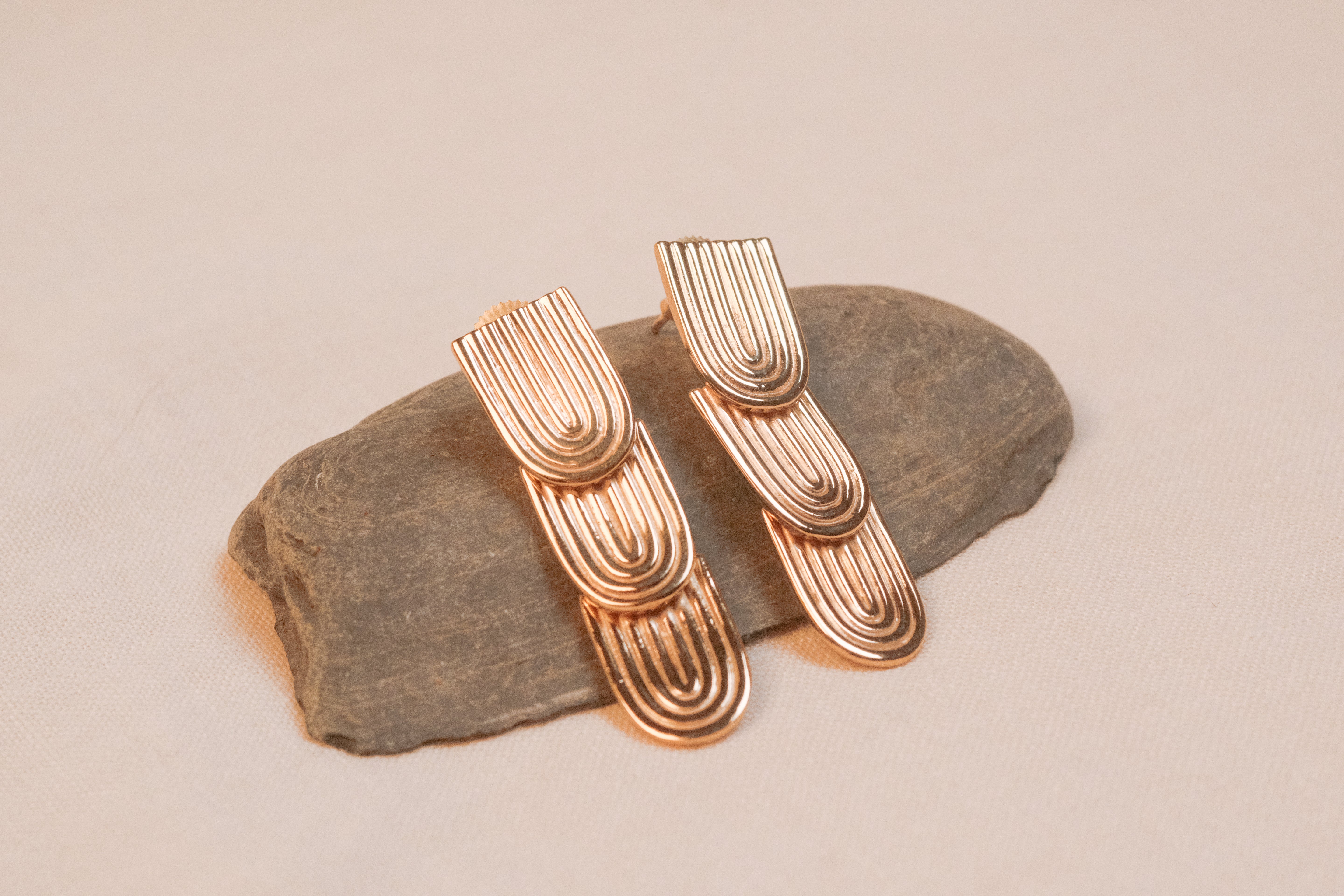 These thick watercress-detailed earrings are a staple piece for your wardrobe. Pairing three layers of beautiful gold-plated pieces create a flowing display that is sure to capture attention. .