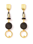 The smooth jasper, when proceeded with placid black disks of ecliptic obsidian that remind one of the dark heavens followed by a circle of golden starry beads, make any ensemble serene. Plated with 18 kt gold.