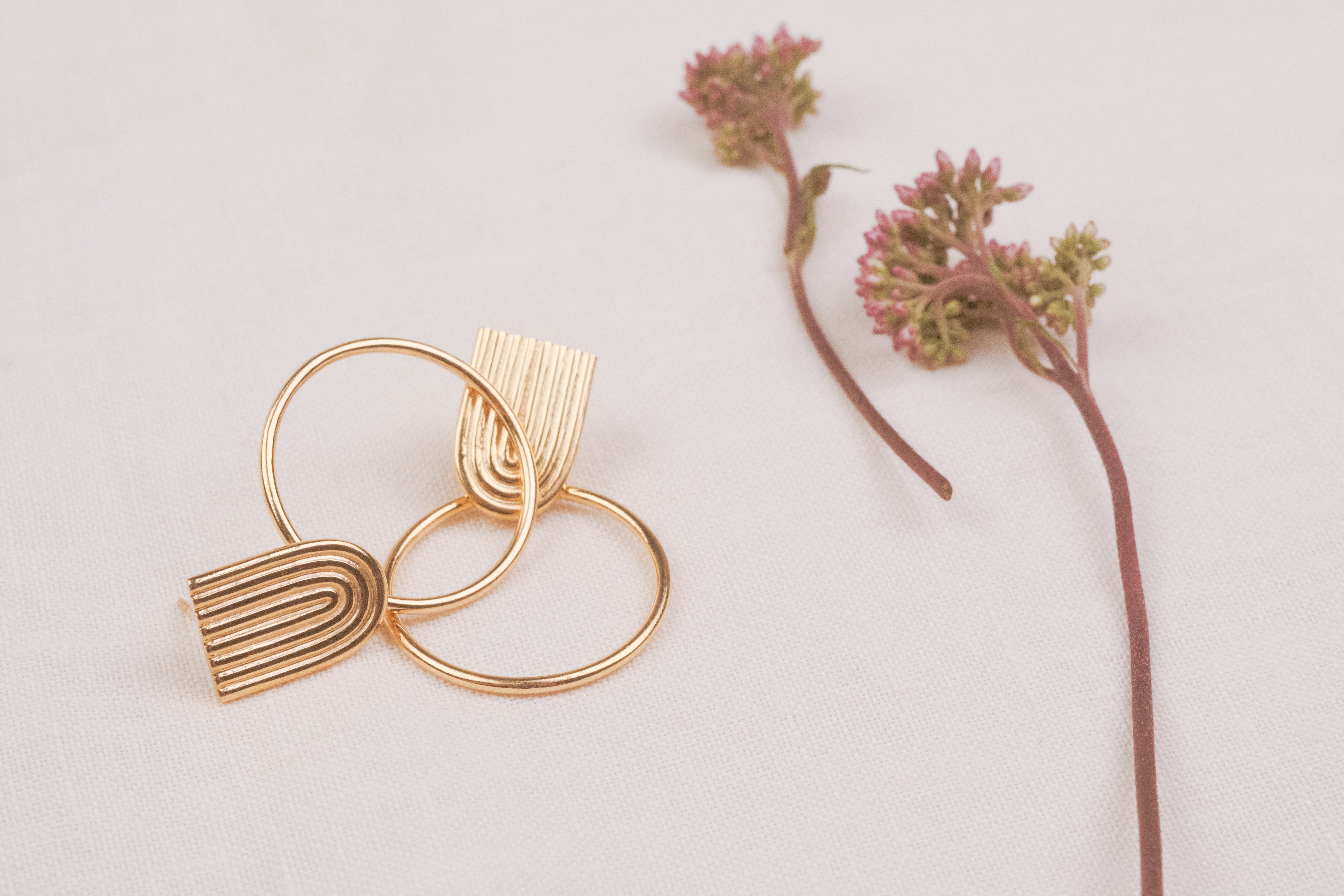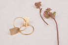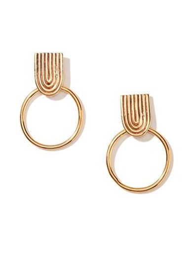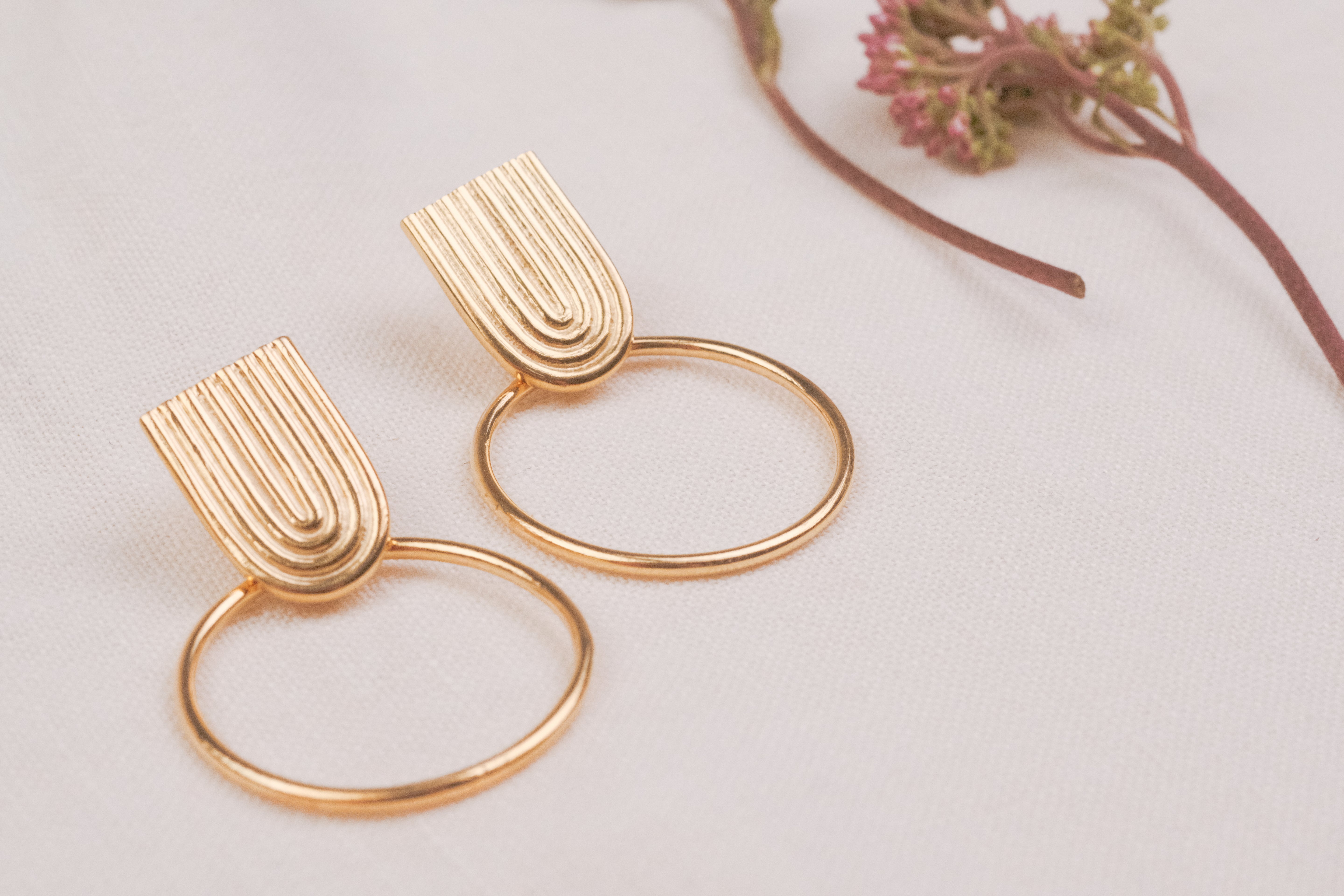 A full circle ring design complements the half ellipse flat stud on a 18 kt gold plated design. This drop earring design is perfect with casual and formal attire. Add elegance to your collection with this unique piece. .