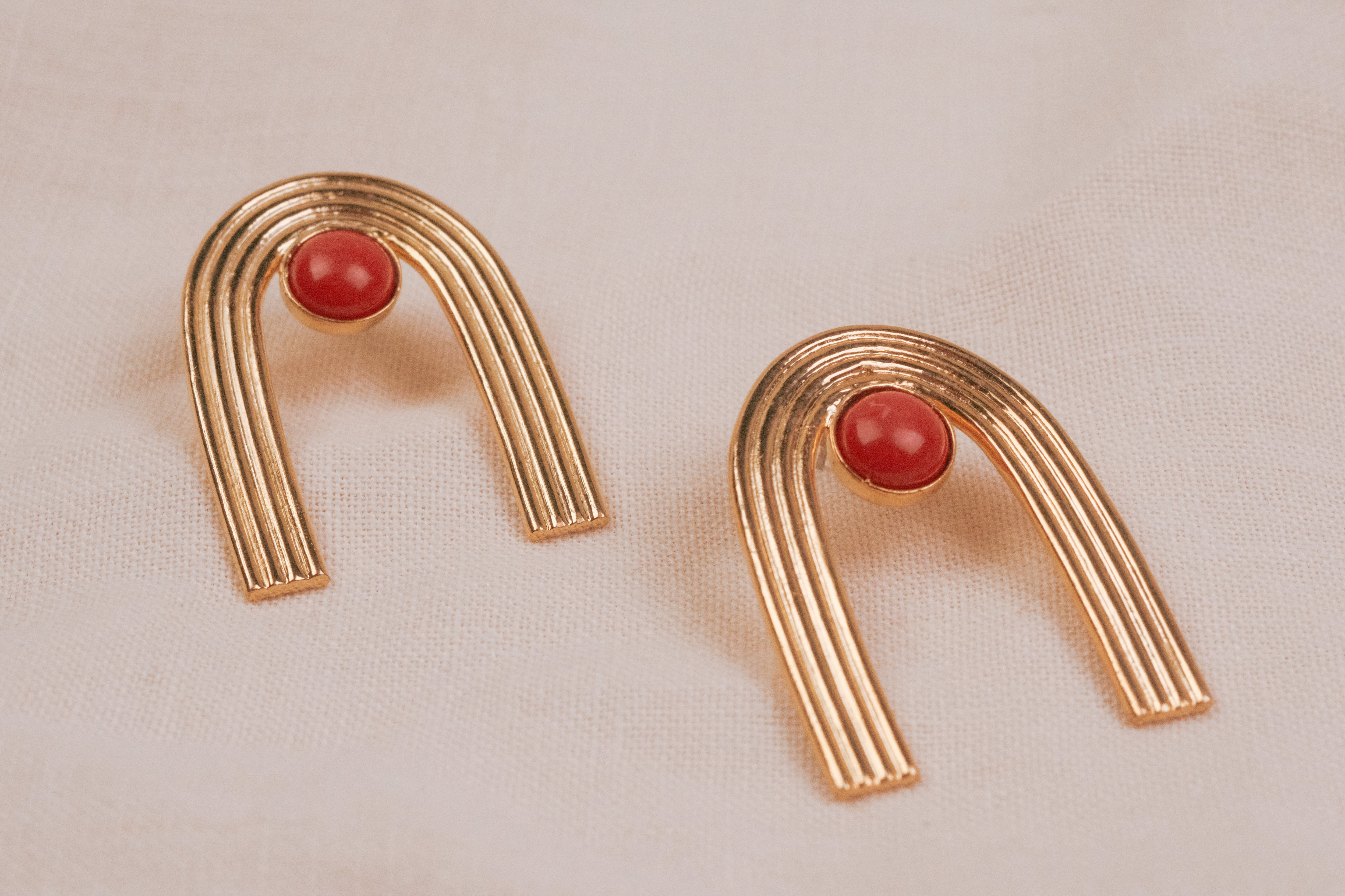 The carefully crafted arcing design creates a perfect harmony alongside a warm red Carnelian gemstone. The elegant 18 kt gold plated design opens a myriad of pairing options with both formal and casual outfits. .