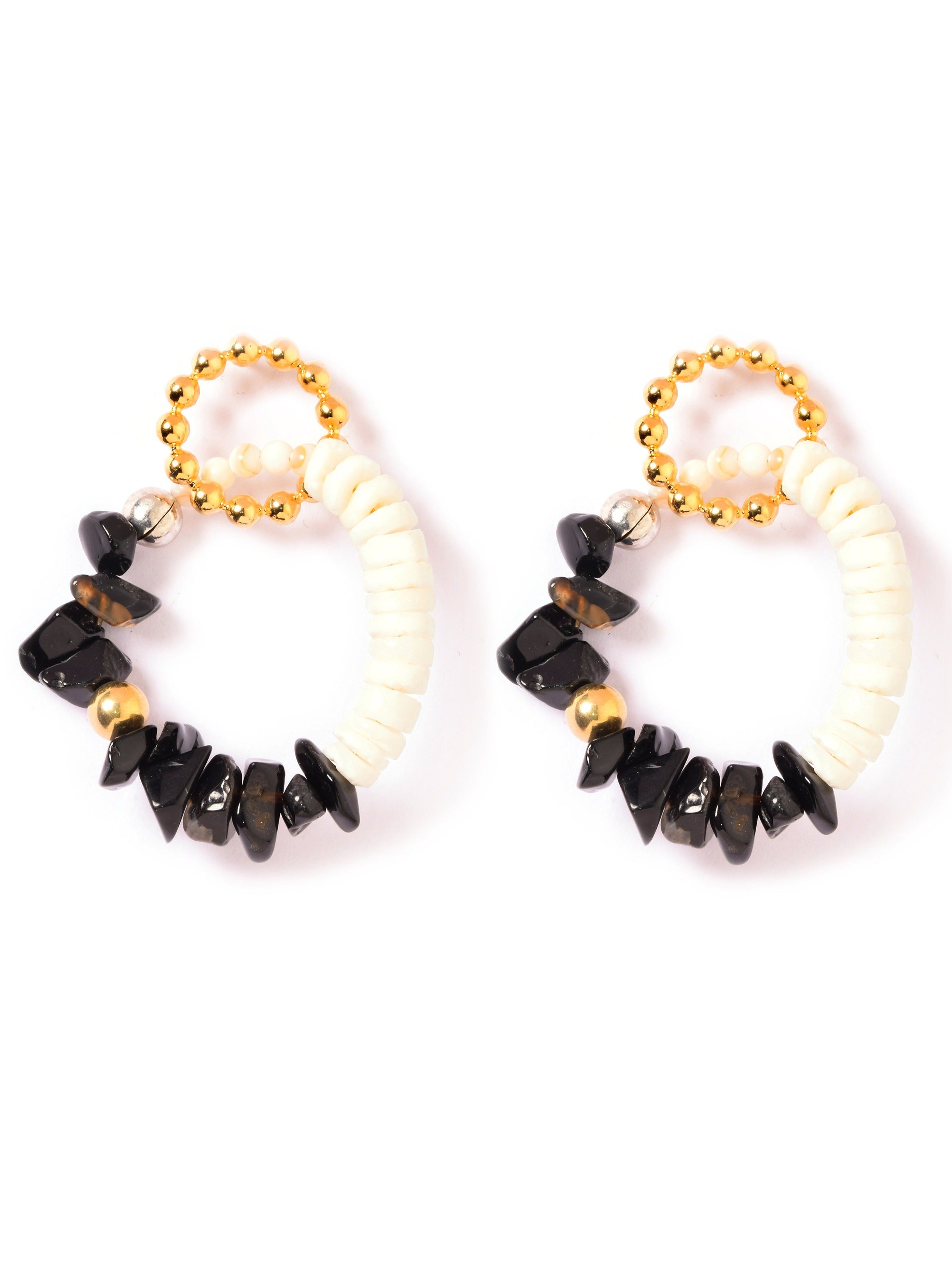 In a subtle combination of colors, golden beaded circles that slip into a circle with a smattering of white pearls, large white jasper, another drop of gold and then black sun stone, all together in a hoop that dangles as you dance, these pearls are ready for anything you are ready to embark upon.