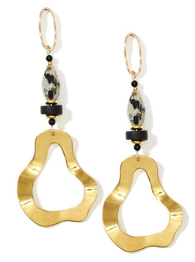 Dalmatian agate and jasper lend their beauty to these distinct earrings, leading delicately to a reflective creased sphere.
