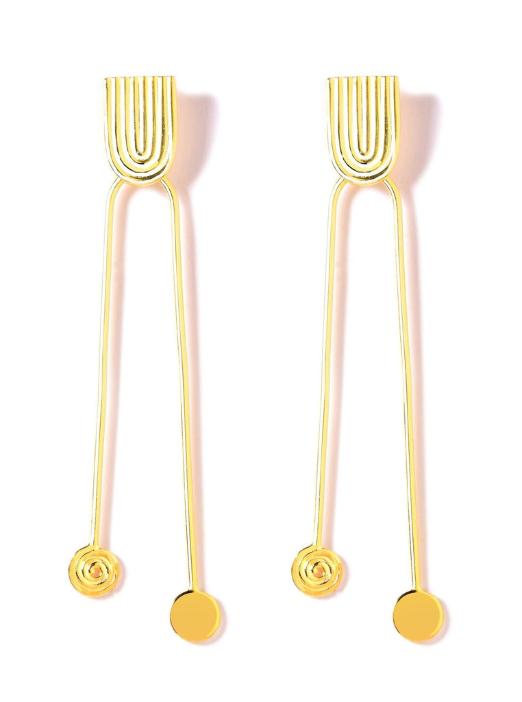 You can definitely escape with any garb you choose when you wear these golden U-stud earrings that end with a circulating spiral on one side and a glowing sphere on the other. Plated with 18 kt gold.