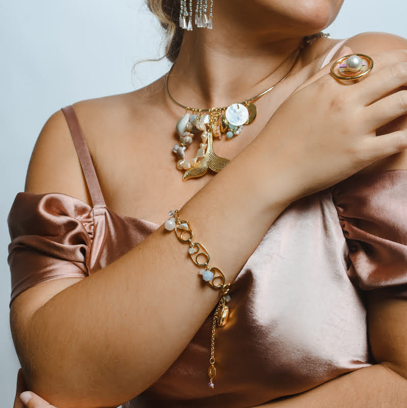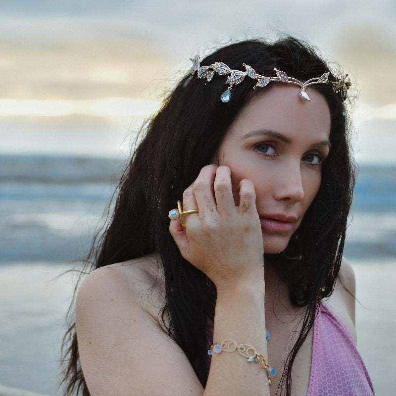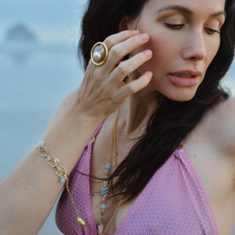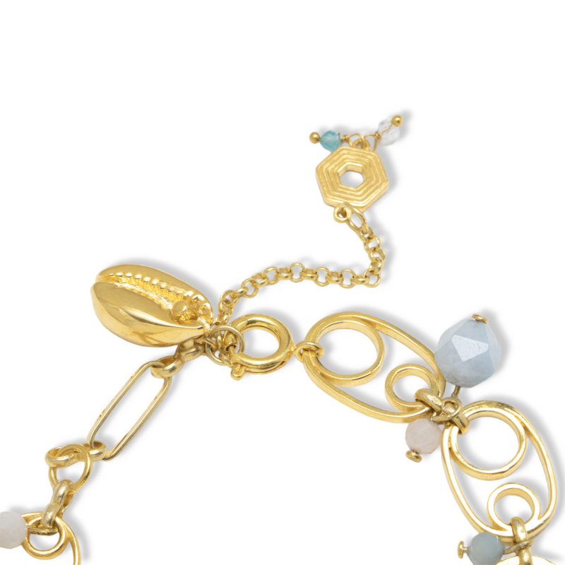 Pieced together with love and intention Agate, Rose Quartz, Aquamarine, Mother Pearl and Sea Shell create the perfect portal of rebalancing through releasing emotional blockages, stimulating your intuition and inviting positive thoughts, wealth and prosperity.