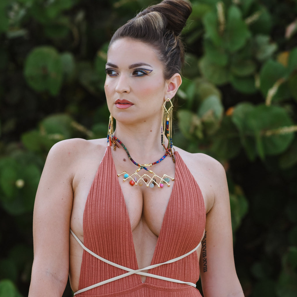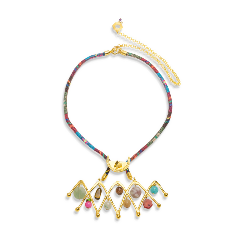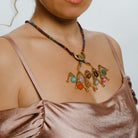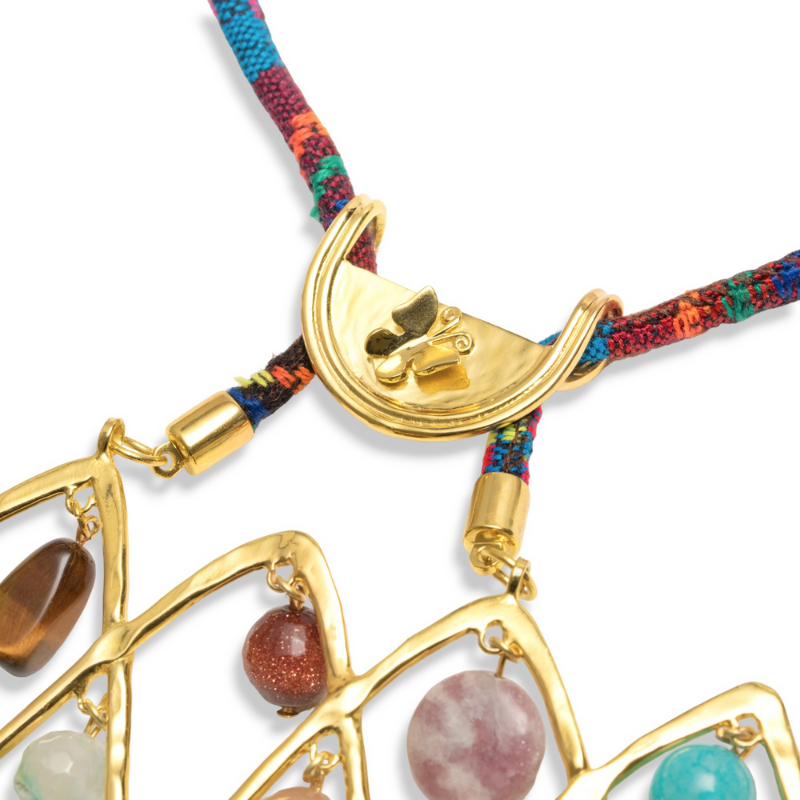 An ode to the very first friendship necklace, and colorful relationships that have shaped us. You are the woven myth. Weaver women who have paved the way have woven you into stories told through lifetimes. Through Quartz and Lava who melted fear and fell madly in love. With Jasper's groundedness, Jade's calming and joyful ways become amplified by the voice of Lapis Lazuli. All coming together to accent your free-spirited soul.