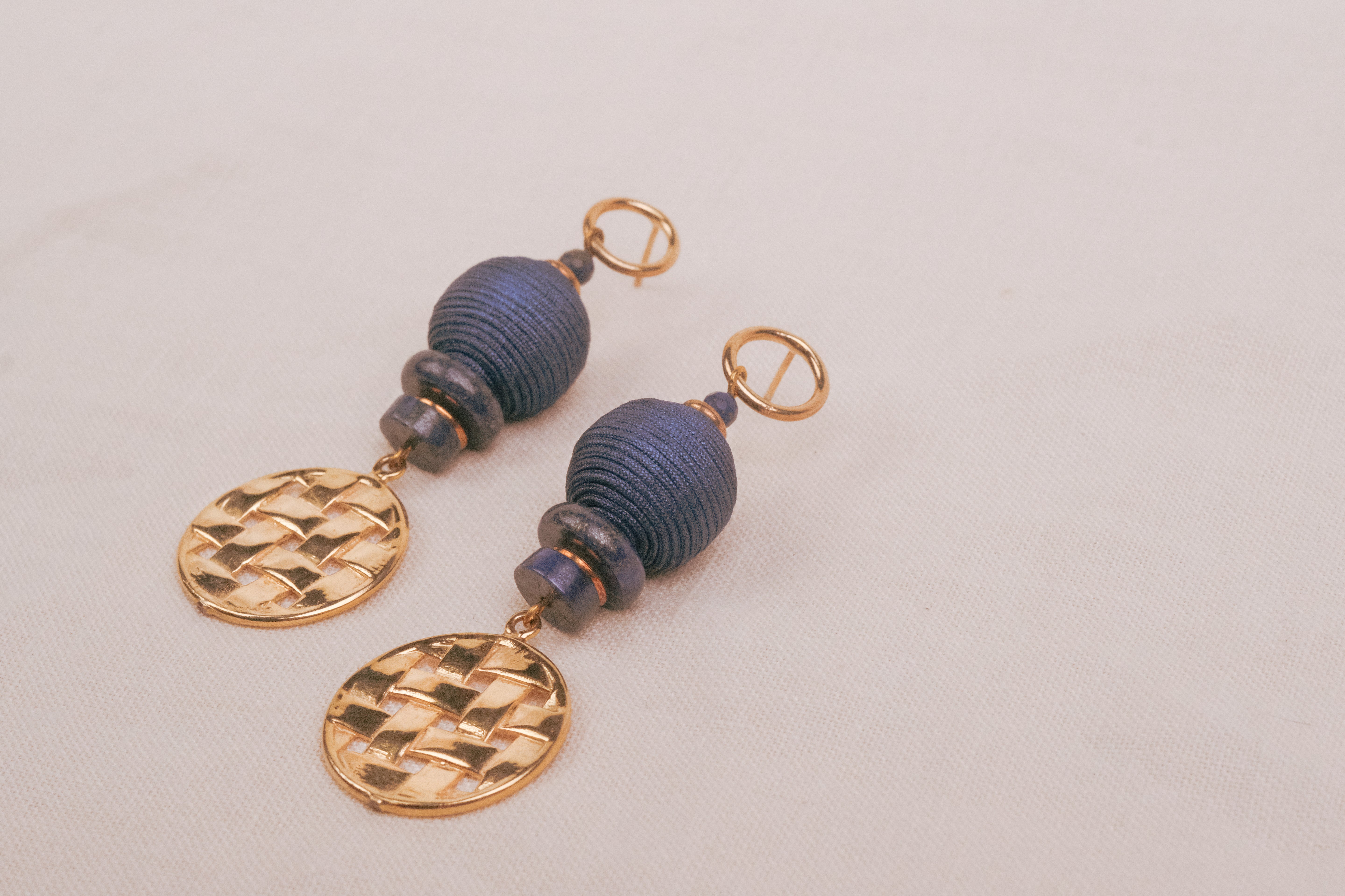 These cheerful jewels start with a golden circle as they open the eyes of all with hand woven blue jasper beads above boisterous blue lapis and dangling the charming woven web of a golden grid that leads to a smile from earring to earring.