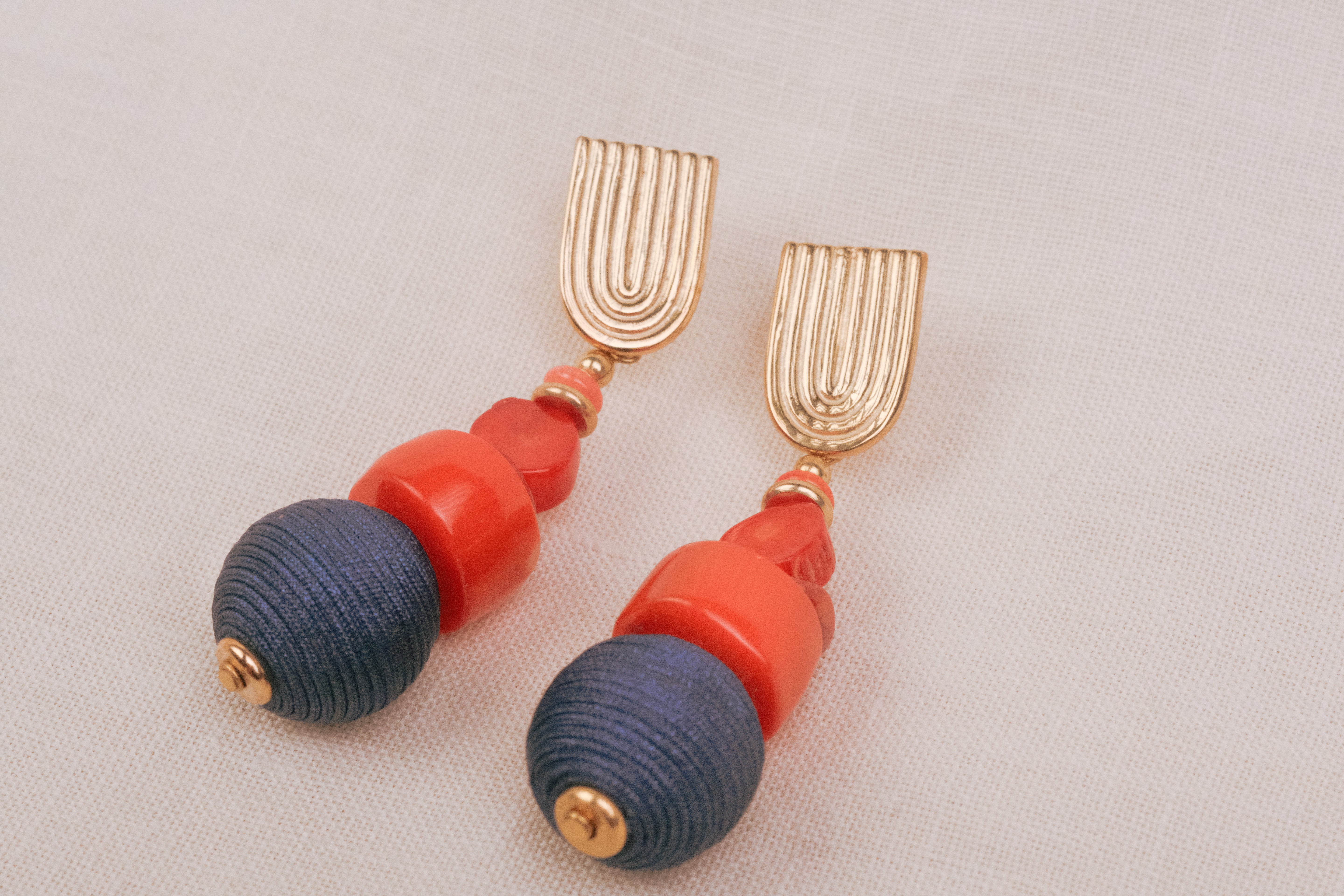 From the golden "U"s to the creative hues of red ending in blue deep sea bamboo coral with just a touch of gold, these dangle earrings charm everyone cheerfully, whether wearing or watching.